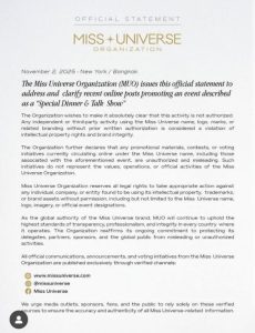 The Miss Universe Organization (MUO) has issued a formal statement disassociating itself from a publicly promoted event described as a “Special Dinner & Talk Show,” warning that the activity is not authorised by the organisation.